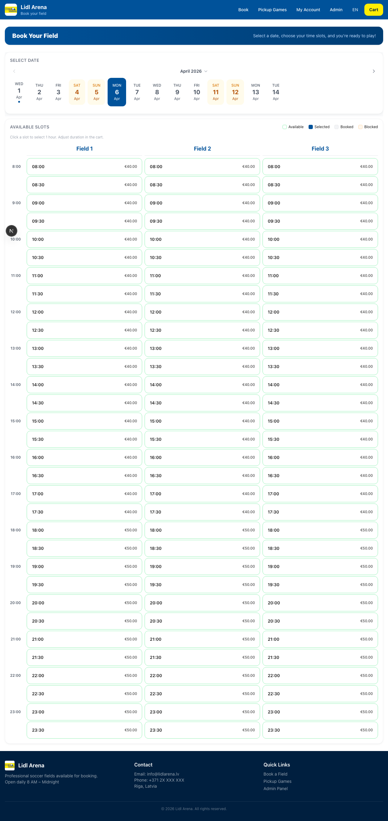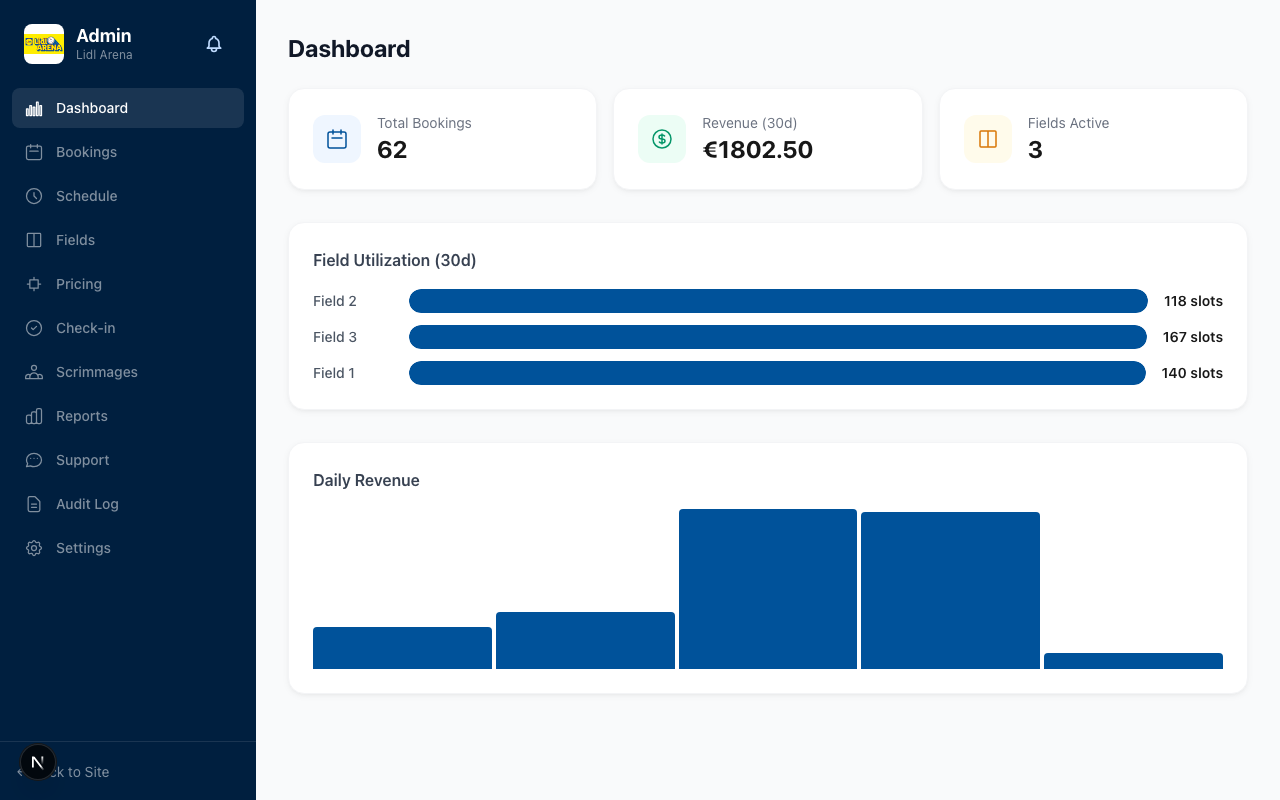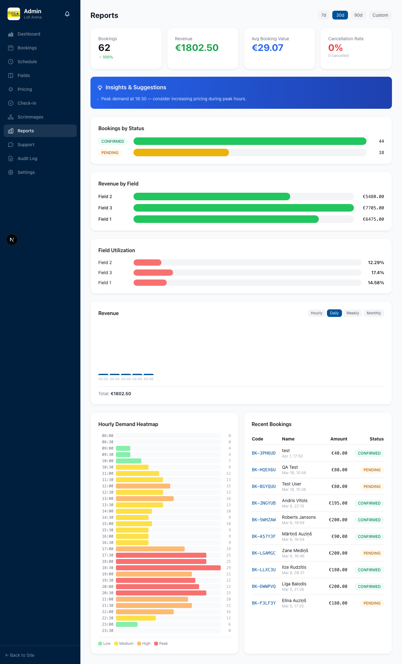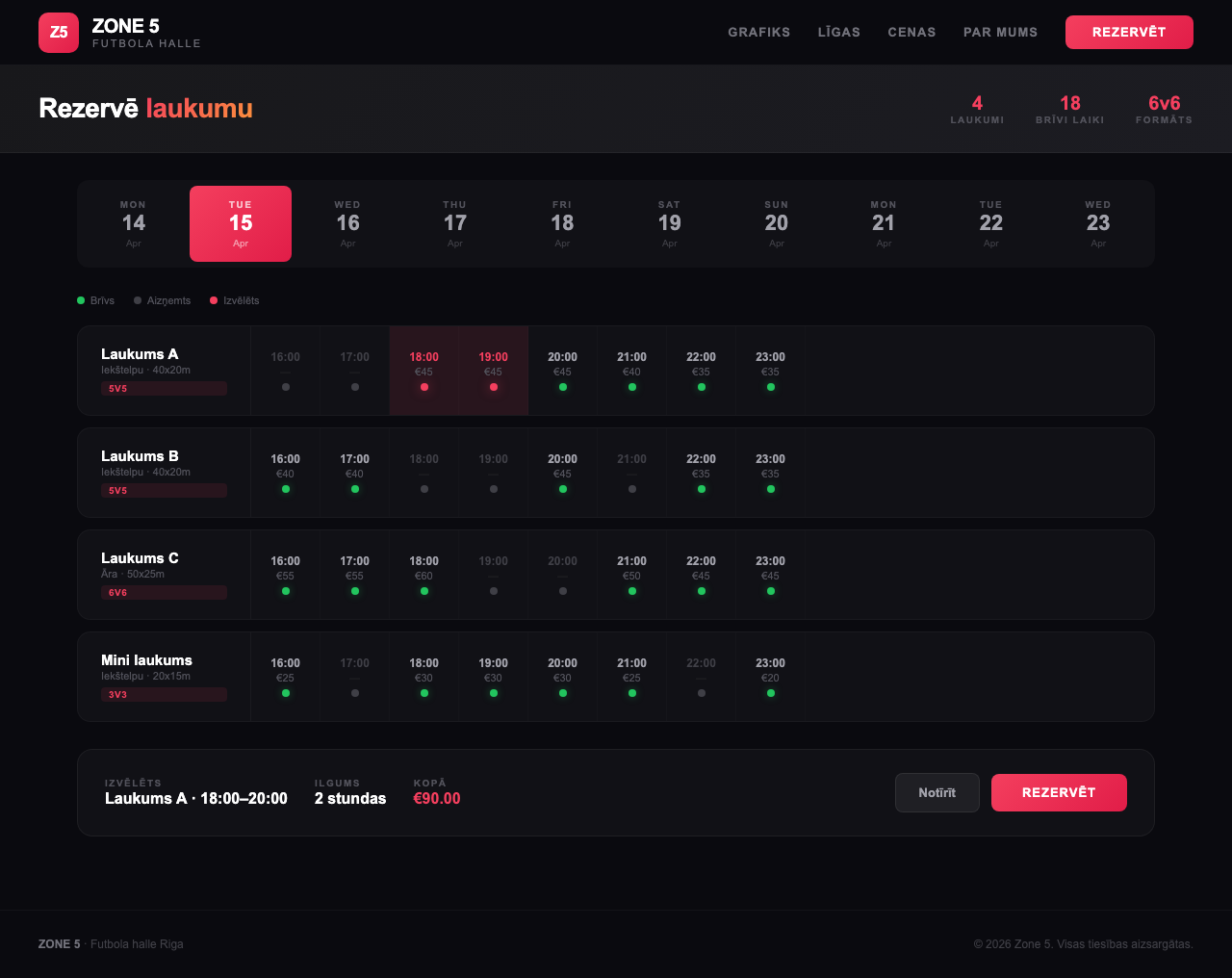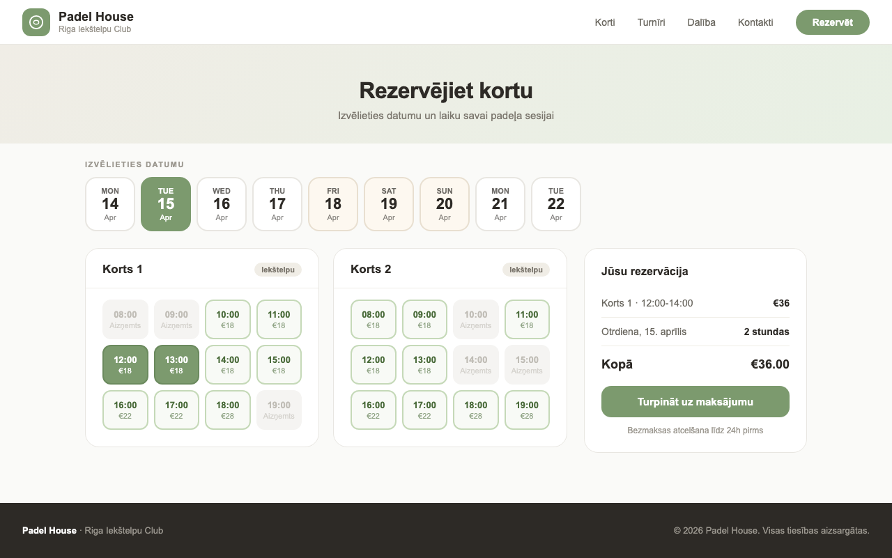 Vienā dienā jūsu laukums iegūst pilnībā brendētu tiešsaistes rezervāciju lapu, integrētu jūsu mājaslapā, pielāgotu jūsu vajadzībām. Klienti rezervē. Jūs pārvaldāt visu no viena paneļa.